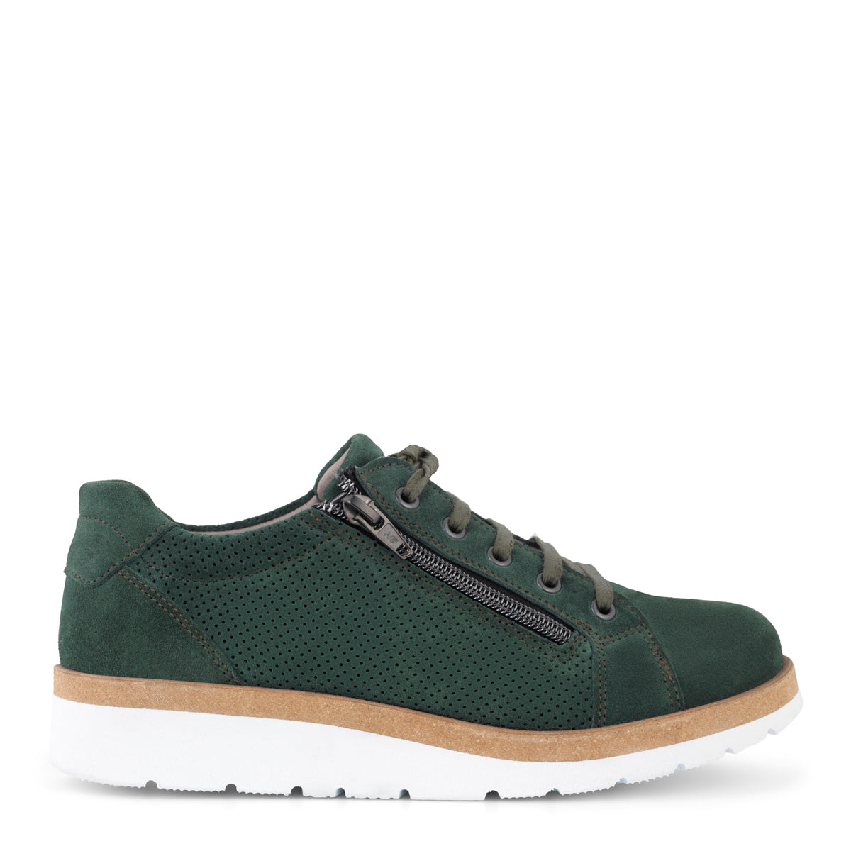 Green suede material, Laced shoe w zipper. Featherlight New Generation EVA outer sole. Light rocker function. Heel lift 28 mm - drop 14 mm. Removable Korrektor® Soft insole.